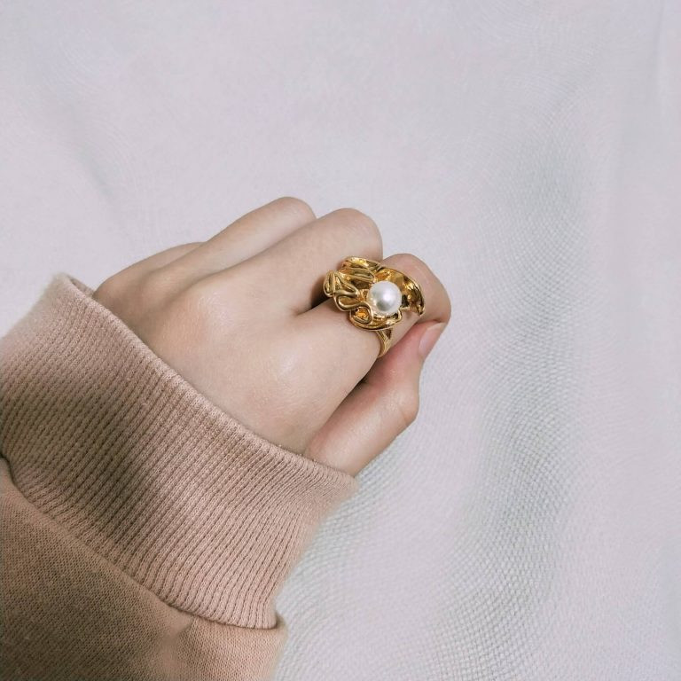 모양의 형태를 조각한 장식 위에 진주 얹어 손바닥으로