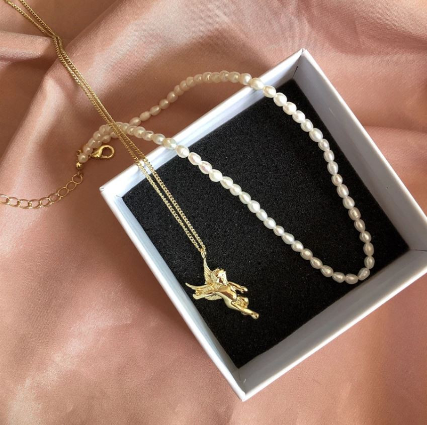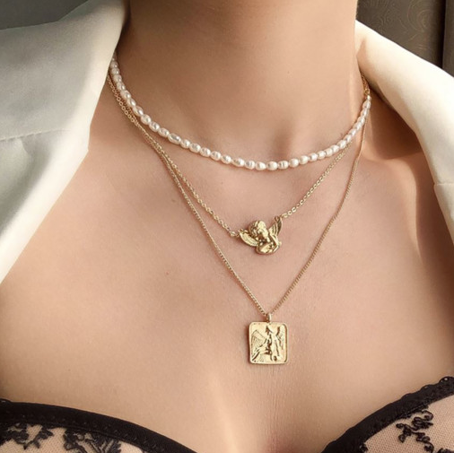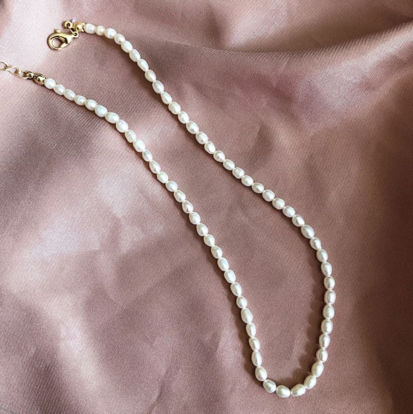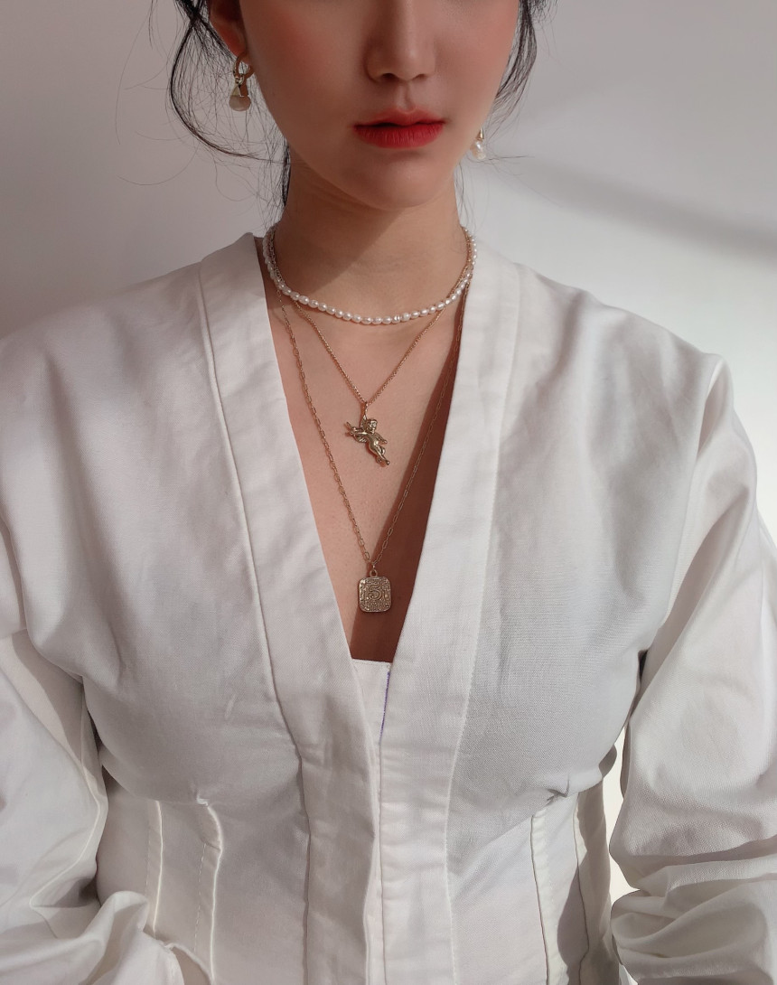 작은사이즈의 바로크 진주초커가 유니크한 느낌을 주어