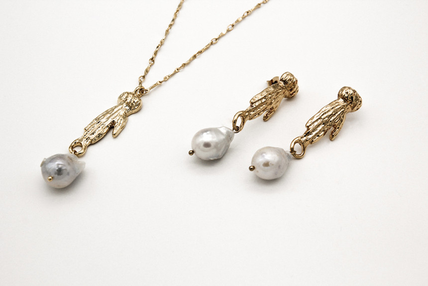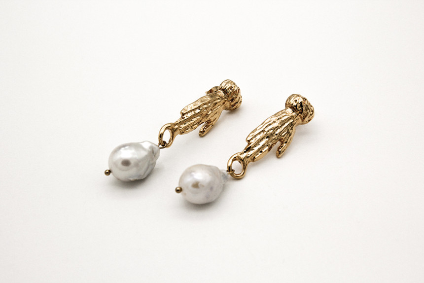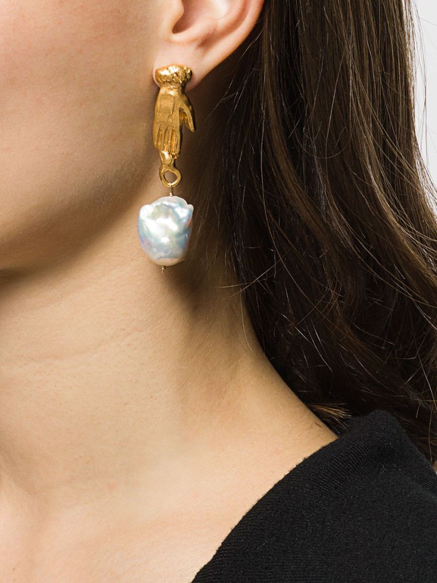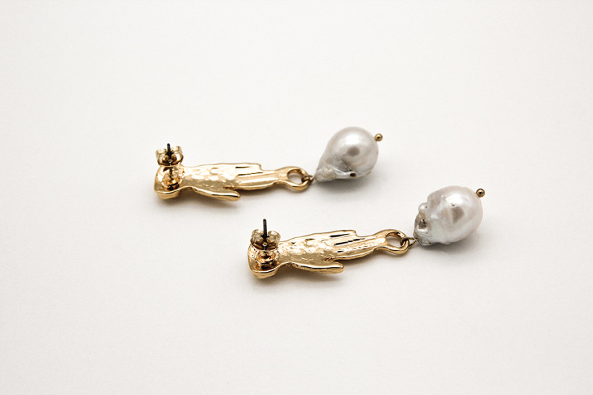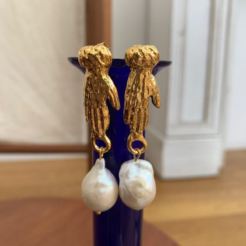 의미를 지닌 손 모양을 조각한 장식 아래 바로크 진주를