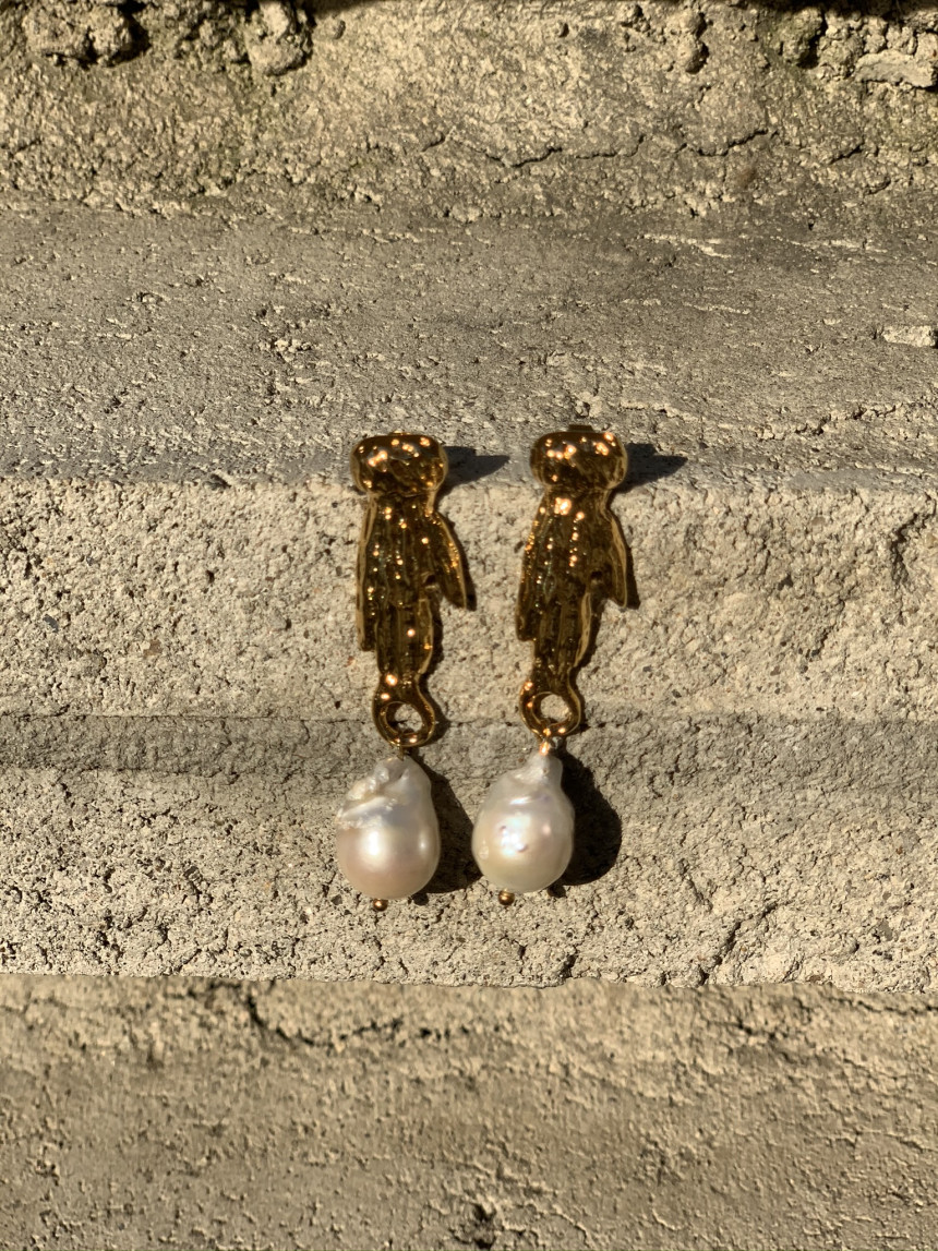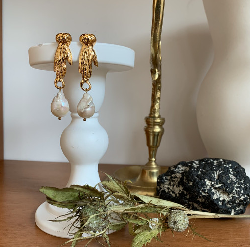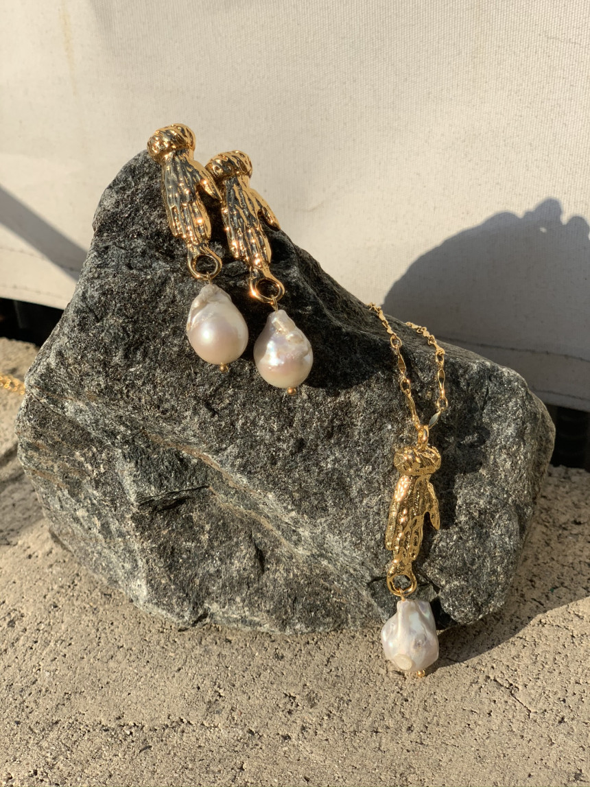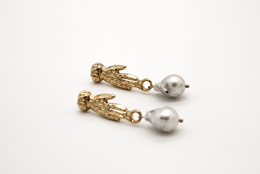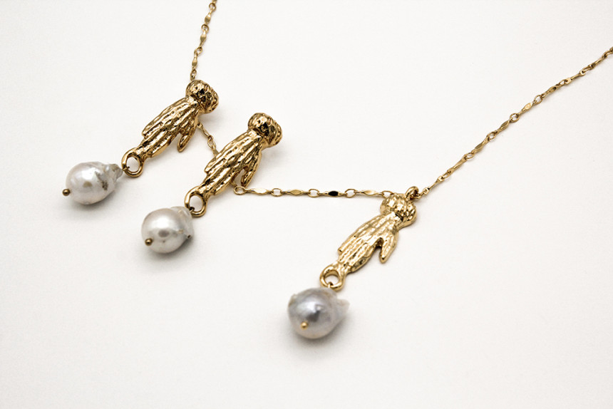 의미를 지닌 손 모양을 조각한 장식 아래 바로크 진주를