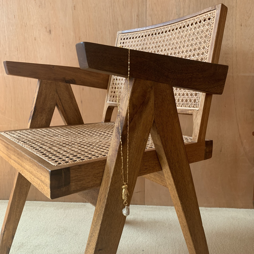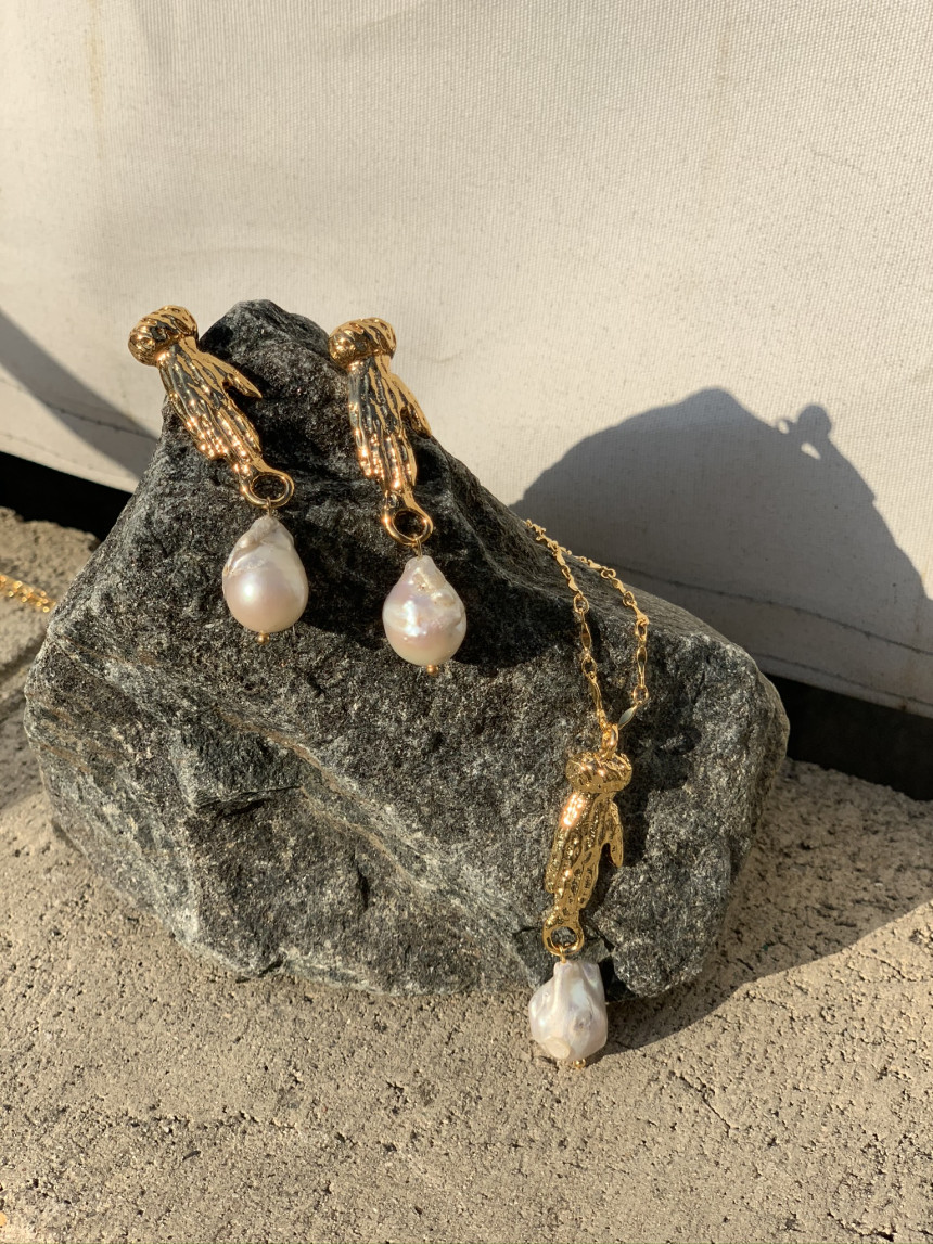 지닌 손 모양을 조각한 장식 아래 바로크 진주를